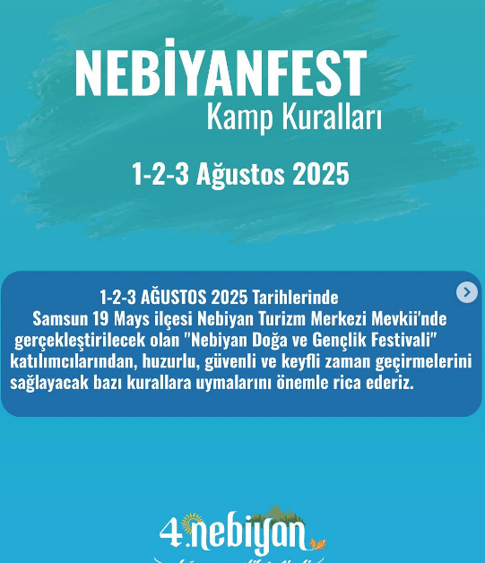 1-2-3 AĞUSTOS 2025 Tarihlerinde Samsun 19 Mayıs İlçesi Nebiyan Turizm Merkezi Mevkii’nde gerçekleştirilecek olan “Nebiyan Doğa ve Gençlik Festivali” katılımcılarından, huzurlu, güvenli ve keyifli zaman geçirmelerini sağlayacak bazı kurallara uymalarını önemle rica ederiz.